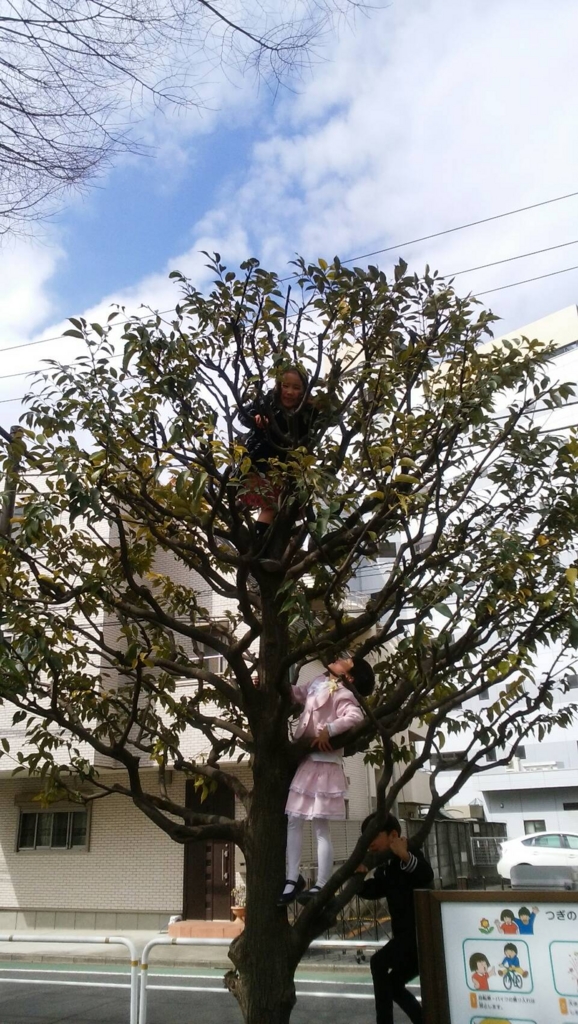(卒園式後の公園で、一番上まで得意の木登りをする長女)
